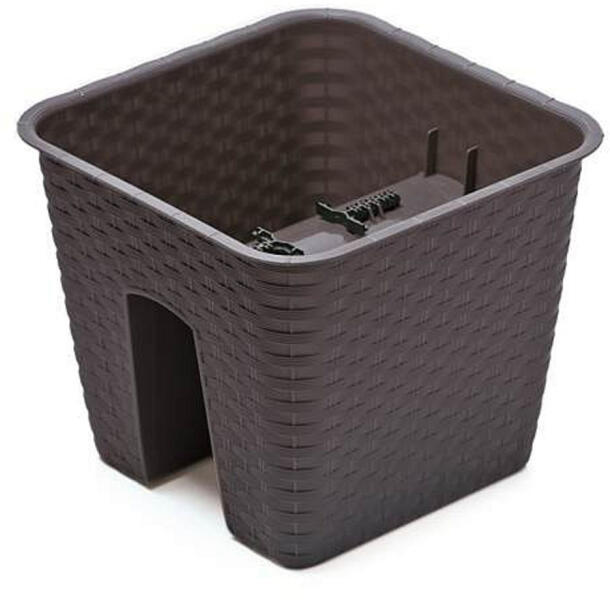 Elegáns, rattan hatású műanyag virágtartó korlátokra és erkélyekre, amely mindkét oldalról dekoratív megjelenést biztosít.